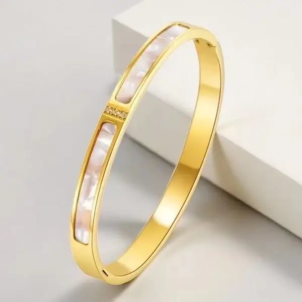 Este elegante brazalete combina la calidez del dorado con la iridiscencia natural del nácar, todo ello realzado por la durabilidad y ligereza del acero de titanio. El diseño presenta una banda de acero de titanio con un acabado dorado brillante, que proporciona una base resistente y sofisticada.